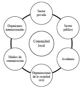 Corzo y Cuadra (2019) mencionan siete sectores que, desde sus interacciones, tienen injerencia en el desarrollo territorial, ubicando a la comunidad local en el centro del diagrama. La comunidad local es beneficiaria del desarrollo territorial, mientras que el desarrollo se mide a partir del PIB per cápita (desarrollo económico) y el índice de desarrollo humano (IDH) (bienestar social) desde la comunidad local. Asimismo, ella tiene injerencia en su proceso de negociación, ya que puede ejercer apoyo o resistencia (figura 4).