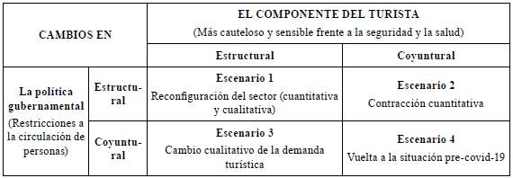 En el caso específico de la crisis de la covid-19, Vargas (2020) ofrece una mirada prospectiva al día después, es decir, al nuevo panorama que puede quedar dibujado una vez que la actividad del sector turístico se reactive tras su obligada hibernación. Este panorama plantea cuatro escenarios, partiendo de datos preliminares de investigaciones de mercado y tomando como base tres variables clave: política gubernamental, comportamiento del turista y cultura organizacional (de las empresas) (tabla 1).
