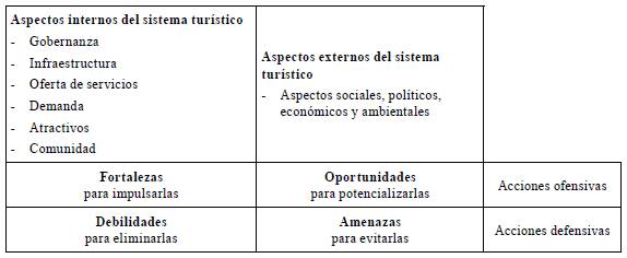 En el análisis cualitativo se identifican las principales oportunidades y limitaciones para el territorio, tanto de los elementos del sistema turístico, como de los aspectos sociales, económicos, políticos y ambientales externos al sistema. Para conseguir estos objetivos se utilizará la herramienta DÜFA para destinos turísticos propuesta en el Manual para el Diagnóstico Turístico Local: Guía para Planificadores de Ricaurte (2009) (tabla 5).