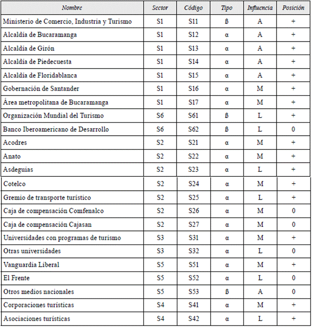 Mediremos el poder de influencia como Bajo (L) Medio (M) o Alto (A), donde se tendrá en cuenta el poder de cada actor para impedir, reorientar o impulsar la estrategia abordada. Así como su posición frente al plan metropolitano de reactivación turística como Apoyo (+), Oposición (-) o Indeciso (0). Finalmente, es necesario caracterizar a estos actores por su ubicación: locales (a), su accionar y ubicación coinciden con los límites geográficos del territorio, o extralocales (B), para aquellos que tienen incidencia en el territorio, pero operan desde otras áreas geográficas (tabla 6).
