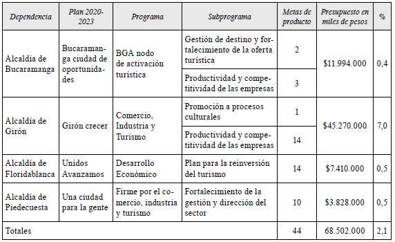 Realizando el mismo análisis, se evidencia que los cuatro municipios integrantes del área metropolitana de Bucaramanga cuentan con COP 68.502.000.000 para el cumplimiento de 44 metas de producto en los próximos cuatro años. De las 44 metas que integran los programas específicos de turismo, únicamente el Plan de Desarrollo de Floridablanca menciona una meta específica que vincula a la covid-19 y su impacto en la actividad turística: "Desarrollar una estrategia para el diseño e implementación de nuevos productos turísticos frente a las exigencias del nuevo mercado por la pandemia covid-19" (tabla 7).