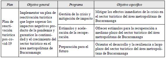 Se propuso un Plan de Reactivación Turística del Área Metropolitana de Bucaramanga que tuviera como objetivo sopesar los impactos negativos producto de la pandemia y garantizar la continuidad y el crecimiento del sector turístico en el área. El plan contiene tres programas, con tres proyectos cada uno. Cada programa obedece a un objetivo específico, a saber: