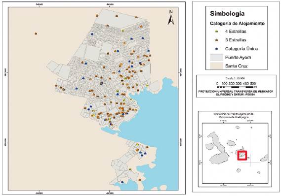 El universo total de los hoteles en Santa Cruz corresponde a 137 establecimientos, que se encuentran identificados en la figura 1, basados en los registros del Observatorio de Turismo de Galápagos a 2018. Se excluyen ciertos hoteles que no se reflejan en el mapa, porque están ubicados por fuera de las coordenadas establecidas para el mismo.