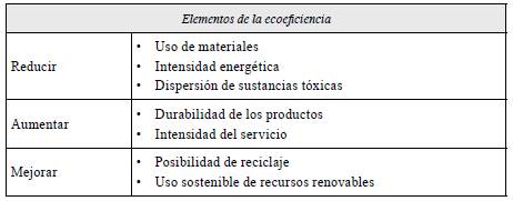 Al hablar de ecoeficiencia se relacionan los aspectos ecológico y económico, es decir, impulsar la aplicación de mejoras medioambientales que lleven a un beneficio económico, de esta manera se promueve el uso de nuevas tecnologías limpias y nuevas prácticas medioambientales en la empresa (Fussler, 1996). La tabla 1 refleja los elementos ligados a la ecoeficiencia.