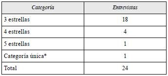 Se realizaron un total de 24 entrevistas a los dueños o encargados de los establecimientos hoteleros, las mismas que se anonimizaron y codificaron de manera alfanumérica. Las entrevistas se aplicaron a las siguientes categorías y clasificación de alojamientos (tabla 2):