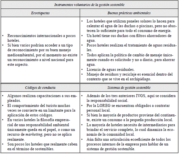 Los conceptos de instrumentos voluntarios en la gestión sostenible y de turismo sostenible se conocen de manera parcial con una idea básica que muchas veces se reduce a prácticas de recolección de basura, ahorro de agua, entre otras, sin comprender el sentido integral de sus implicaciones en términos de sostenibilidad (Nicholas et al., 2009).