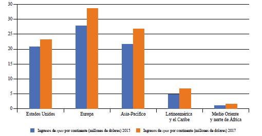 A nivel mundial, la industria del spa se caracteriza por presentar una notable concentración. Los principales mercados receptores (Estados Unidos, China, Alemania, Japón y Francia) concentran el 48 % de los ingresos mundiales, sin embargo, este liderazgo se ha ido diluyendo en los últimos años como resultado del intenso crecimiento registrado en otros ámbitos. En 2017, doce países tuvieron ingresos anuales por concepto de spa que superan los USD 1.000 millones: Estados Unidos, España, Francia, Alemania, Finlandia, Suiza, Japón, China, Indonesia, Australia, Tailandia e India. Indonesia y Australia superaron el umbral del billón de dólares por primera vez (EuroPraxis, 2018). En Europa, la oferta se especializa en centros de alto nivel ubicados en Francia, Alemania y Suiza, que buscan mejorar los resultados de los spas tradicionales por medio de tratamientos con tecnología, lo cual trae consigo que el costo de estos establecimientos sea alto, pero asociado a mejores resultados (figura 2).