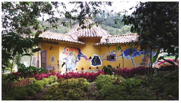 La ecoaldea (figura 3) cuenta con capacidad para 24 personas y está conformada por cabañas construidas en palma de nacuma. En su interior puede visualizarse una forma piramidal constituida por maderas de pino y moncoró que aromatizan todo el lugar y les permiten a los huéspedes entrar con mayor facilidad en un estado de descanso óptimo. La gerente también mencionó que la principal característica de esta habitación-cabaña es que posee un sistema que le permite al huésped mantenerse lejos de las cargas electromagnéticas, por ello, son apropiadas para los visitantes que quieren liberarse del cansancio por medio del contacto con la naturaleza y el descanso (Rodríguez, 2019).