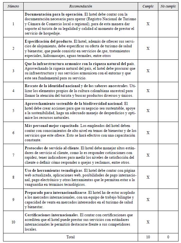 Antes de iniciar el análisis de los servicios y las características del hotel, se aplicó el Programa de Transformación Productiva para comprobar el grado de cumplimiento de las diez recomendaciones dadas por el Gobierno nacional para configurar un turismo de bienestar y salud productivo y competitivo. Se corroboró que el hotel cumple con tales recomendaciones (tabla 1), esto indica que está altamente capacitado para el turismo de este tipo.