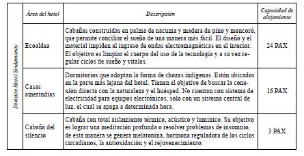 El hotel cuenta con tres tipos de alojamiento diferenciado según la tipología edificatoria y los servicios prestados (tabla 2). Como queda evidenciado en la visita a las instalaciones, la consulta de la página web y la entrevista a la gerente, cada uno de ellos cuenta con una característica idónea para el turismo de salud y bienestar. En la tabla 3 se especifica cómo está dividido el hotel y la descripción de cada una de las zonas con sus capacidades de alojamiento.