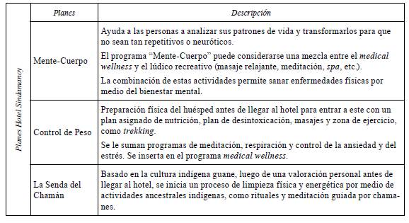 En la tabla 3 se encuentran descritos los planes ofrecidos por el Hotel Sindamanoy. Cada plan cuenta, a su vez, con tres aspectos (bienestar, lúdico o recreativo), ya que algunas terapias coinciden con las características establecidas para los diversos planes, como son las prácticas de masajes relajantes, talasoterapia, deportes y meditación. Además de cumplir con estas características, cuentan con otras diferenciadoras, como son la consulta de bienestar y la cabaña del silencio, que ofrecen experiencias únicas y personalizadas a los huéspedes (Rueda, 2020).