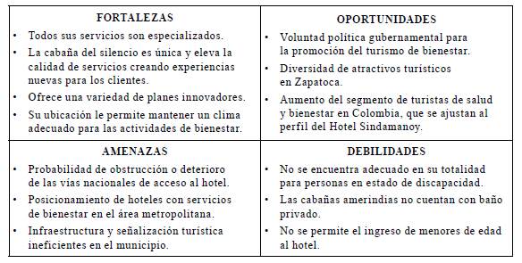 Por último, la información recolectada se comparó con la literatura de turismo de salud de otros países, para poder verificar cuáles elementos eran los más relevantes del hotel desde el punto de vista de la innovación en el sector y que fuesen lo suficientemente significativos para darlos a conocer. A partir de esta información, se aplicó una matriz DOFA (debilidades, oportunidades, fortalezas y amenazas) con el fin de determinar los elementos con los que cuenta el hotel para afirmar su posición como potencia en turismo de salud y bienestar en la región.