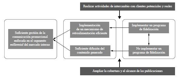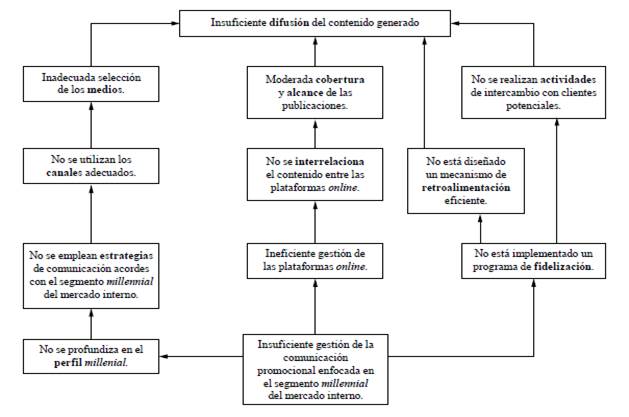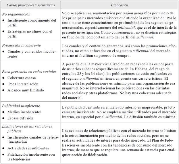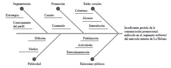 En la figura 6 se representan, en forma de espina de pescado, las causas principales y secundarias de la "insuficiente gestión de la comunicación promocional enfocada en el segmento millennial del mercado interno de La Habana", lo que se sustenta a continuación, en la tabla 1.