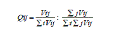 Todas las variables fueron procesadas geoestadísticamente mediante una matriz de cociente de localización, la cual es una medida de la proporción que una variable determinada representa en una superficie municipal, comparada con la proporción de la misma variable a nivel estatal. Los resultados indican el grado de concentración que tiene una demarcación municipal en algún parámetro considerado, por ejemplo, en este caso, densidad de biomasa, de áreas naturales, de hoteles, etcétera. Su expresión matemática según Vázquez (2013) es: