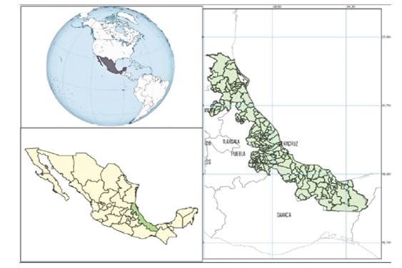 El estado de Veracruz es una de las 32 entidades federativas de la República Mexicana. Las coordenadas extremas de este estado son norte 22° 28' y sur 17° 09' de latitud norte; este 93° 36' y oeste 98° 39' de longitud oeste. El estado está conformado por una superficie cercana a los 72.000 km2 (Instituto Nacional de Estadística y Geografía [INEGI], 2016). Ubicado en la porción oriental del país, cuenta con 212 municipios, varios de ellos puertos marítimos de importancia internacional. Pese a que su distribución territorial tiene una dirección preferencial norte-sur, la mayoría de sus municipios presentan un clima cálido o semicálido tropical dada su baja altitud (figura 1).
