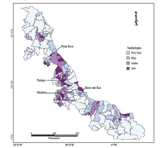 El análisis también reveló que los municipios con bajos índices de potencial turístico gerontológico abundan tanto al norte como al sur del estado. Por ejemplo, al norte, los municipios Ozuluama (con clave municipal 121), Panuco (123), Tempoal (161), Tantoyuca (155), Tamiahua (151), Temapache (160), Ixhuatlán de Madero (83), Tampico Alto (152), Chicontepec (58), El Higo (205) y Tihuatlán (175) quedaron por debajo del promedio del análisis de potencial turístico en el modelo, al igual que los municipios sureños de Uxpa-napa (210), Las Choapas (61), Jesús Carranza (91), San Juan Evangelista (142), Minatitlán (108), Hidalgotitlán (70) y Juan Rodríguez Clara (94) (tabla 3). Al respecto, es lamentable observar que municipios con las biomasas vegetales más frondosas, como Uxpanapa y Las Choapas, aparecen en el sótano del presente recuento por tener menguados otros criterios del índice de potencial turístico.