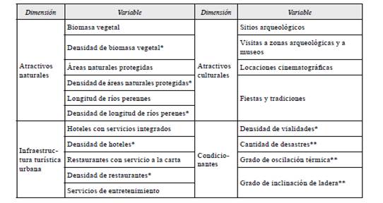 Dada la escala geográfica del análisis, la selección de indicadores que ayudaron a definir los niveles de potencial turístico gerontológico -indicadores a los que se encuentran sujetos los distintos municipios de Veracruz- fue discutida y justificada desde el punto de vista socioespacial que proponen Reyes-Pérez et al. (2012) y Mikery y Pérez-Vázquez (2014) para cartografiar y analizar el potencial turístico a nivel municipal, con la intención de tener un marco epistemológico acorde con el objetivo. En ese sentido, la propuesta consta de 19 indicadores básicos (tabla 1), agrupados en cuatro dimensiones de potencial turístico, a saber: atractivos naturales, atractivos culturales, infraestructura turística urbana y condicionantes para el turismo gerontológico, todos los cuales formaron parte del análisis cuantitativo. A continuación, se detalla cada una de estas dimensiones.