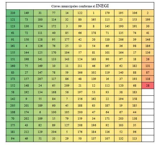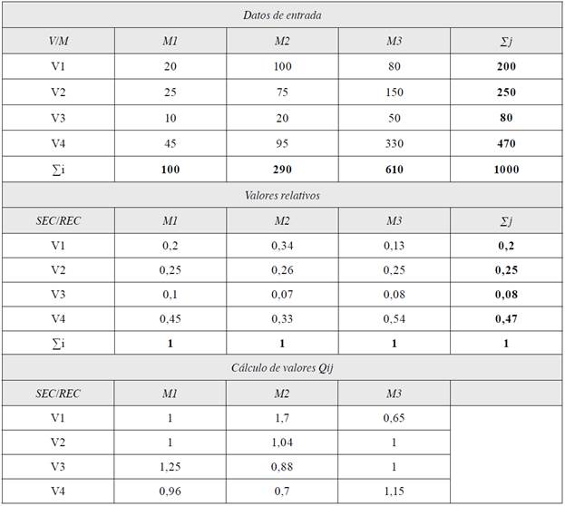 Su ordenamiento en una matriz se ejemplifica a partir de un marco de contraste entre variables contra municipios. En este caso, las variables (V) se refieren a los parámetros de potencial turístico gerontológico y las variables (M) aluden a las unidades geográficas de estudio (municipios de Veracruz), cuya representación visual puede apreciarse en la tabla 2. En este caso pedagógico, las variables de mayor significación para la muestra total territorial serían, en primer lugar, V1 para el municipio 2 (M2), seguida de V3 para M1, luego V4/M3, y así sucesivamente. La representación cartográfica de los resultados se realizó en GvSIG 2.4.