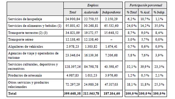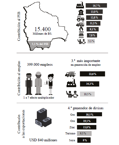 Para la economía boliviana, el turismo representó un movimiento de 15.416 millones de bolivianos para la gestión de 2019, compuesto en un 62 % por el turismo interno y en un 38 % por el turismo receptivo (tabla 8). Este movimiento económico se traduce en un aporte de 400.000 empleos directos e indirectos en toda la economía boliviana (tabla 9). Lo que significa que esta industria contribuyó con el 10,5 % del empleo nacional y se constituyó en la tercera industria que mayor incidencia tuvo en la generación de oportunidades laborales en 2019, después de la industria manufacturera y del comercio automotor (INE, 2019).