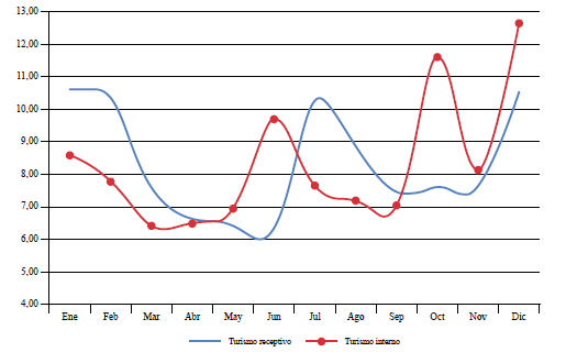 Los primeros impactos de la COVID-19 se sintieron a partir de la segunda quincena de marzo y en los meses de abril y mayo de 2020, con una paralización completa de la actividad turística. Si bien el fenómeno sanitario se presentó durante la temporada baja -como se muestra en la figura 2, sobre estacionalidad-, los impactos más relevantes se notaron en la temporada alta, es decir, de junio a agosto.
