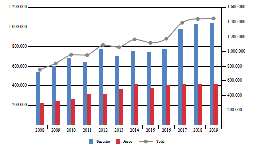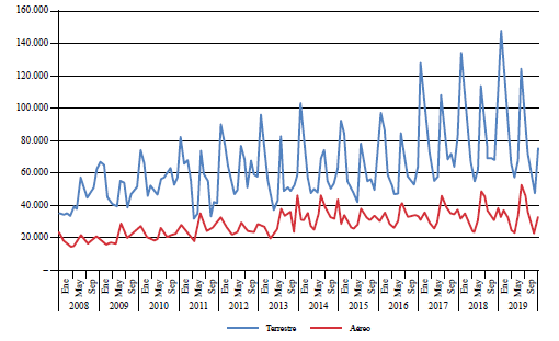 A esa tendencia creciente que se muestra en los flujos de viajeros hay que añadir que la brecha existente entre la llegada de viajeros vía terrestre y los ingresos recibidos por llegadas vía aérea se triplicó en los últimos años (figura 4), lo cual resalta la necesidad de dividir el análisis según el modo de ingreso al país. Esto se ratifica con la información proporcionada por la Dirección General de Migración y el Viceministerio de Turismo (2016), que muestra que los países cercanos (Argentina, Chile, Perú, Brasil y Colombia) ingresaron al país mayoritariamente vía terrestre (78,3 %) y en menor medida vía aérea (21,4 %), lo cual no ocurrió con los mercados de larga distancia, como el norteamericano y el europeo, en cuyos casos, el 79,1 % de los viajeros entraron vía aérea y solo el 20,9 % lo hicieron vía terrestre.