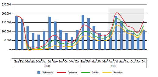 Según los resultados, se estimaba que, para mediados del año 2021 (escenario medio), el turismo volvería a recuperar los niveles de flujo alcanzados en el año 2019 (figura 5), aunque el escenario pesimista lo extendía hasta finales de 2021.