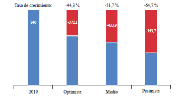 Estos tres escenarios permitieron proyectar la pérdida económica sufrida por el turismo receptivo durante la gestión de 2020, que podría una caída del 51,7 % de los ingresos en comparación con los obtenidos en la gestión de 2019, lo cual significaría dejar de percibir cerca de 433,9 millones de dólares estadounidenses, esto en un escenario medio (figura 6).