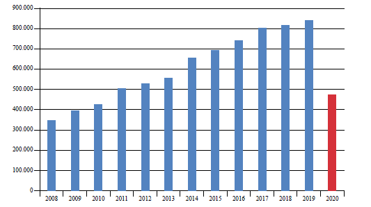 En síntesis, y bajo una perspectiva histórica, el turismo receptivo pudo presentar la mayor pérdida económica de su historia, con cifras negativas de crecimiento de aproximadamente el -51,7 % en comparación con 2019, lo que significaría 433,9 millones de dólares americanos menos en la economía para la gestión de 2020 (figura 8).