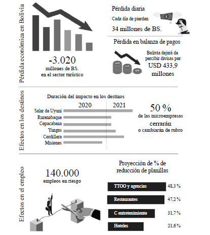 Los resultados revelan un impacto sin precedentes en la economía del sector turístico en el país, con una posible pérdida económica de 3.020 millones de bolivianos en la gestión de 2020, una reducción de más de 140.000 empleos, un aparato turístico debilitado que no podía cubrir sus obligaciones y pudo terminar cerrando su operación en los meses siguientes al inicio de la pandemia, especialmente en las empresas altamente dependientes del turismo receptivo, como las agencias de viaje y las operadoras de turismo, que no podrían captar con facilidad al mercado nacional, ya que no busca intermediarios. Por otra parte, los establecimientos de hospedaje sufrieron un doble impacto por la pérdida, primero, del turismo receptivo y, segundo, del mercado corporativo nacional, debido al teletrabajo y las videoconferencias, que disminuyeron casi a cero los viajes corporativos en la gestión de 2020. Sin embargo, se consideraba posible entonces iniciar la recuperación hotelera con el mercado vacacionista nacional.