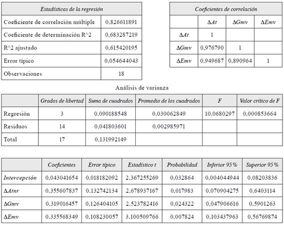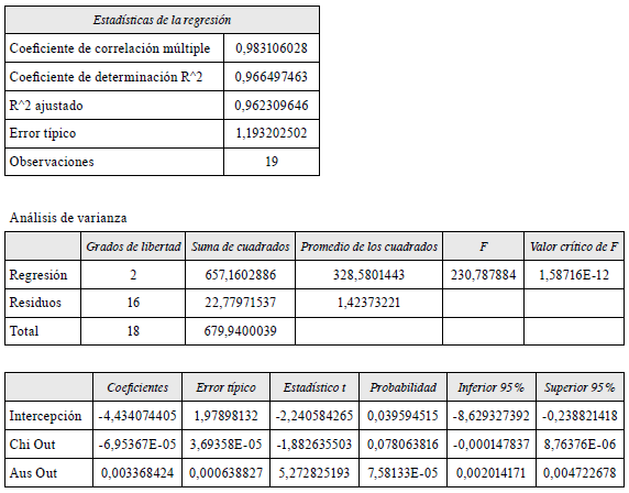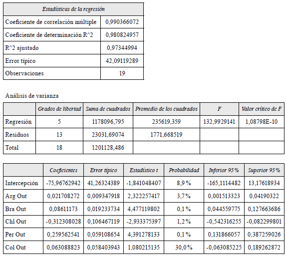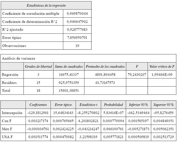 Con base en esa función, se realizó la regresión múltiple (tabla 1). Si bien estos factores explican, en gran medida, la generación de ingresos por concepto de turismo receptivo, el gasto y la estadía media no varían significativamente debido a que, en Bolivia, estos indicadores se calculan por medio de encuestas de gasto, realizadas cada cuatro años, por lo que las variaciones responden al crecimiento entre encuestas, y su valor es producto del crecimiento medio anual.