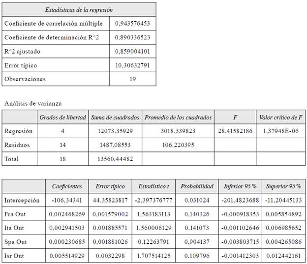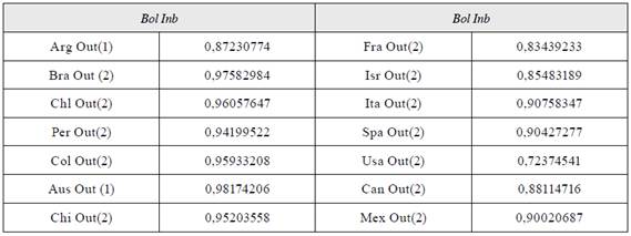 Para que esta ecuación tenga sentido, los flujos de turismo emisivo de los n mercados deberían tener una correlación significativa con el flujo de turismo receptivo de Bolivia. Sin embargo, no sucedió con 9 países (Ecuador, Paraguay, Uruguay, Bélgica, Alemania, Suiza, Reino Unido, Japón y Corea del Sur), por lo que se redujo a 14 países, que aún representan el 89 % del flujo de visitantes que Bolivia recibe (tabla 2).