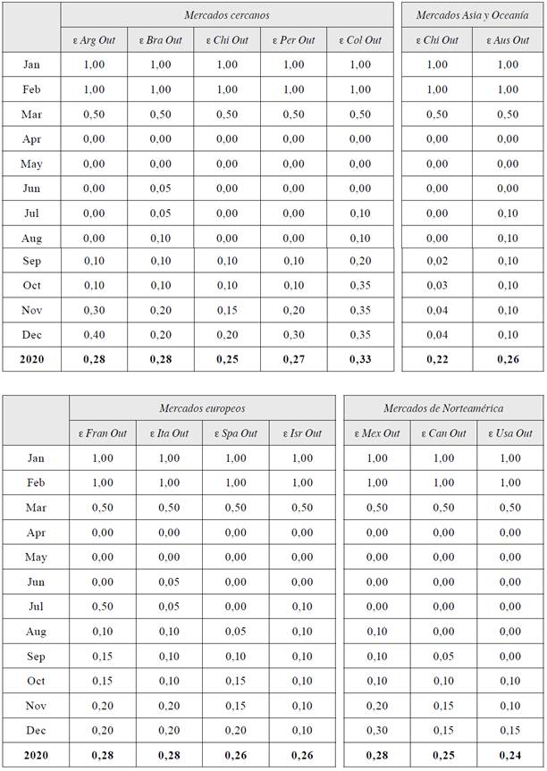 La expectativa en el modelo para predecir el flujo entre 2000 y 2018 se considera 1, lo cual no afecta la ecuación. Sin embargo, durante la gestión de 2020, esa normalidad se vio afectada por la pandemia. En consecuencia, la expectativa, que antes era 1 porque existía normalidad en los 12 meses del año, en 2020 pasó a ser valorada entre 0 a 1, lo que afectó directamente la variación del flujo de cada mercado emisor.
