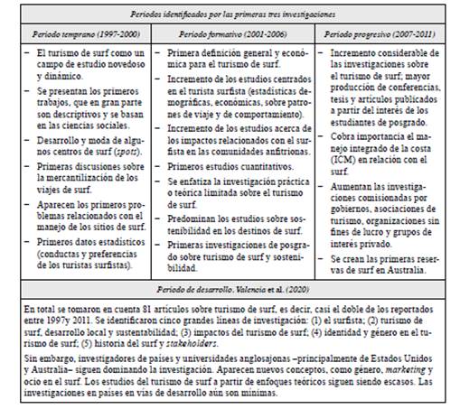 Lo anterior ha permitido que el surf, como deporte y fenómeno social, haya logrado en las últimas décadas cierto interés como objeto de estudio (Frank et al., 2009; Ponting & McDonald, 2013). A partir de las revisiones de la literatura realizadas por Martin y Assenov (2011; 2012) y Assenov y Martin (2010), se evidencia que el turismo de surf como objeto de estudio ha sido dominado principalmente por países como Australia, Estados Unidos, Nueva Zelanda y Reino Unido. Sobre la base de estos estudios, los autores han identificado tres etapas principales respecto al estado del arte de este tipo de turismo: el periodo temprano (1997-2000), el periodo formativo (2001-2006) y el periodo progresivo (2007-2011) (tabla 1).