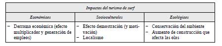 Como se puede observar, varios de esos impactos surgen a partir del desarrollo del turismo, sin importar el segmento estudiado; sin embargo, algunos -como el hacinamiento de spots, el localismo y la protección del entorno natural- parecen estar estrechamente relacionados con el turismo de surf y el turista surfista.
