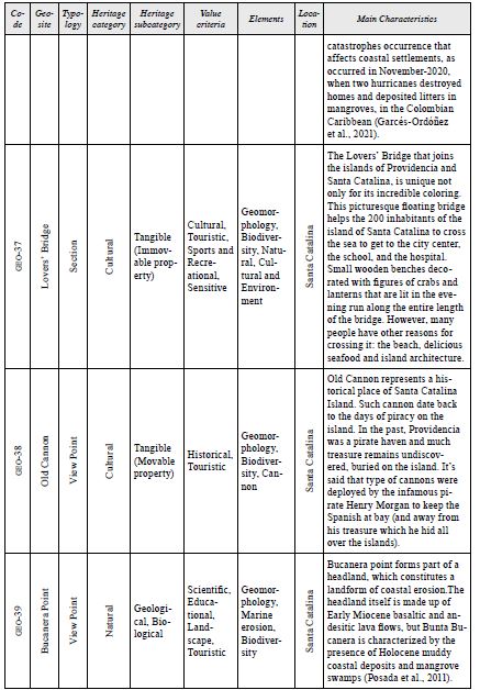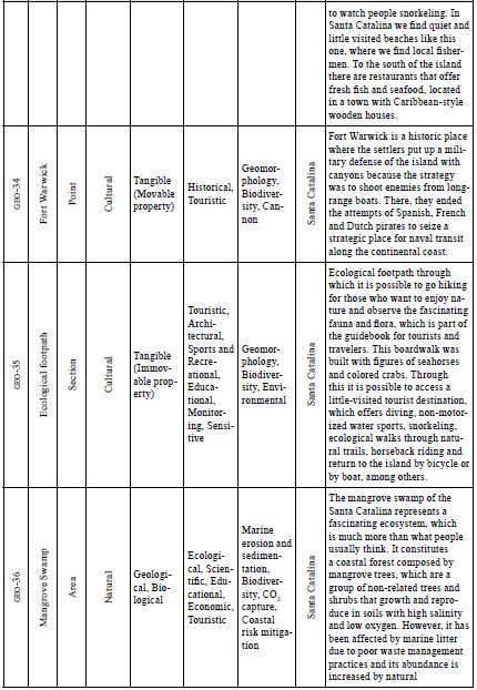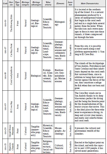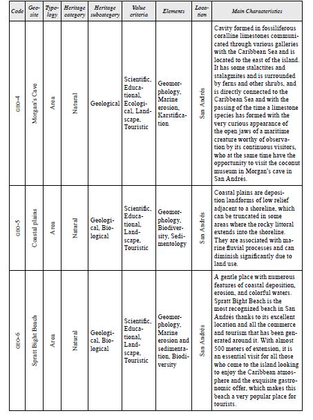 These potential geosites reveal very interesting aspects on the regional evolutionary history of the asapsc, including several coastal erosion and sedimentation landforms, ecosystem diversity with a rich fauna and flora, and cultural traditions of the native Raizal people. In addition, there are many other geosites that can be included in geotourism activities. How ever, priority should be given to the geosites further described below, because, in addition to their attractiveness and accessibility, already possess infrastructure necessary for the development of tourism. The proposed inventory of sites of geological interest includes 17 potential geosites located throughout this archipelago, which can be considered under a geoconservation perspective.