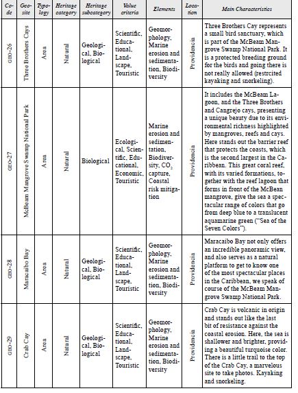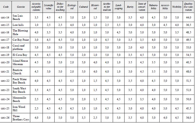 Thirty-nine (39) sites of geological interest were identified, described, and valued, which, according to the adapted and modified methodology of Brilha (2016), present a scientific, educational, and tourist value of 36.5 to 58.0. Of this inventory of sites of geological interest, twenty-three (23) have potential as geosites because they have a score equal to or greater than 50.0. Morgan's Cave (geo-4) and Rocky Cay (geo-13) represent the most important geosites according to the score obtained (58.0), followed by Johnny Cay (geo-7) and McBeam Mangrove Swamp National Park (geo-27) with 57.0; Old Point Mangroves National Park (geo-9) with 56.5; Three Brothers Cays (geo-26) with 56.0; Haynes Cay (geo-11) with 55.5; Crab Cay (geo-29) with 55.0; Santander Cay (geo-8), El Cove Bay (geo-19) and Mangrove Swamp (geo-36), with 54.5; Spratt Bight Beach (geo-6) and Ecological footpath (geo-35) with 54.4; Cocoplum Bay Beach (geo-12) and Morgan's Head (geo-32) with 53.5; Coral reef platform (geo-18) with 53.0; Rose Cay (geo-10) with 52.5; Big Pond Lagoon (geo-2) with 52.0; Fresh Water Bay Beach (geo-22) with 51.5; South West Bay Beach (geo-23) and Fort Warwick (geo-34), with 51.0; The Peak (geo-31) with 50.5; Manzanillo Beach (geo-24) with 50.0. From the educational and tourist point of view, these geosites reflect the need to carry out the installation of signage and interpretive panels aimed at a general public, which facilitate not only the development of geo-educational activities but also the identification and understanding of the geological elements and processes present there. It is equally important to note that the absence of infrastructure and facilities to provide security and a better experience to the public is mainly observed.