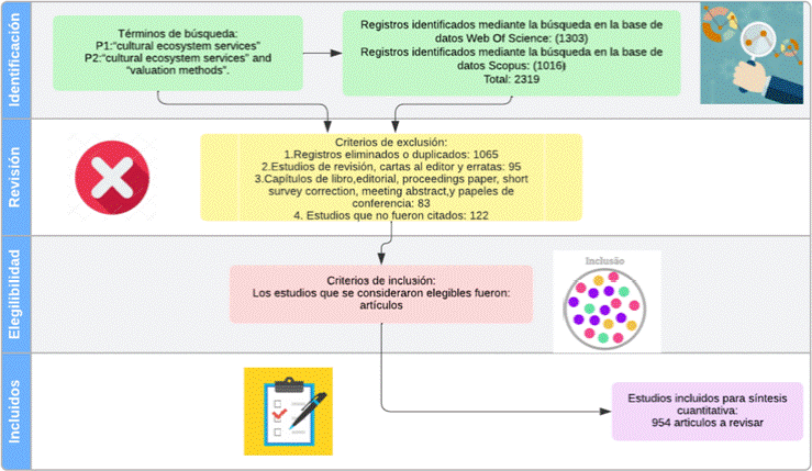 La investigación se llevó a cabo de acuerdo con la metodología de la Declaración prisma (Preferred Reporting Items for Systematic Reviews and Meta-Analyses) del año 2021, se desarrolló en cuatro etapas y sus resultados se sistematizaron y se exponen en el flujograma que compone la Figura 1. La recuperación de la información se realizó a partir de las bases de datos isi Web of Science (http://www-isiknowledge.ez163.periodicos.capes.gov.br) y Scopus (http://scopus.com.ez163.periodicos.capes.gov.br), para lo cual se hizo uso de las siguientes palabras clave: "cultural ecosystem services" y «"cultural ecosystem services" and "valuation methods"». La búsqueda seleccionó trabajos que tuviesen en el título, el resumen o las palabras claves los términos mencionados anteriormente. Los estudios que se consideraron elegibles fueron artículos. Los criterios de inclusión y exclusión estable cidos para los documentos se presentan en la Figura 1.
