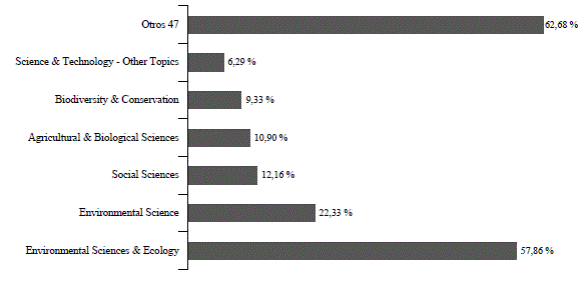 Un total de 954 documentos fueron revisados y clasificados en las siguientes áreas de conocimiento: Environmental Sciences and Ecology (57,86 %) y Environmental Sciences (22,33 %) (Figura 2). Una misma publicación tenía a menudo amplias áreas de conoci miento debido a que los servicios ecosistémicos culturales son una de las cuatro categorías principales de servicios. Sin embargo, los servicios culturales no pueden tratarse de forma independiente y dependen de los servicios de provisión, regulación y apoyo, al mismo tiempo que la expresión de los servicios ecosistémicos culturales influye en la forma en que se ven y gestionan los ecosistemas (Tengberg et al., 2012).