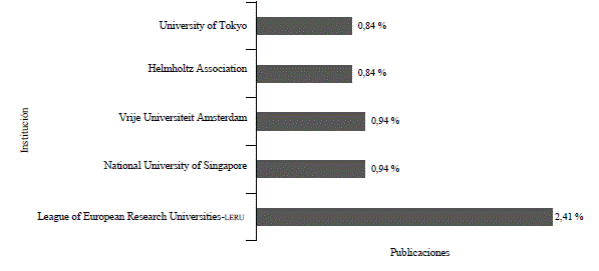 Las instituciones que más investigan sobre los servicios de los ecosistemas culturales son The League of European Research Universities (lerlj), con 23 publicaciones (2,41 %); la National University of Singapore, con 9 publicaciones (0,94 %); la Vrije Universiteit Amsterdam, con 9 publicaciones (0,94 %); la Helmholtz Association, con 8 publicaciones (0,84 %); y la University of Tokyo, con 8 publicaciones (0,84 %) (Figura 3). La mayoría de los estudios de sec hasta la fecha emanan del hemisferio norte (especialmente de Europa y Estados Unidos) y se centran en paisajes terrestres, pero dejan una ausencia de estudios de sec costeros, marinos y estuarinos (Ahtiainen et al., 2019; Blythe et al., 2020; Kobryn et al., 2018; Martín et al., 2016).