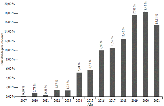 Como se muestra en la Figura 4, ha habido un incremento significativo de la producción científica a lo largo de los años; en 2020 hubo un pico de producción, con 268 artículos publicados debido al aumento en la colaboración científica durante los tiempos de pande mia. La colaboración puede darse a diferentes escalas espaciales (por ejemplo, nacional o internacional, intra o interinstitucional), por lo tanto, las colaboraciones pueden ocurrir entre investigadores de la misma institución, entre instituciones del mismo país o entre diferentes países (Nabout et al., 2015).
