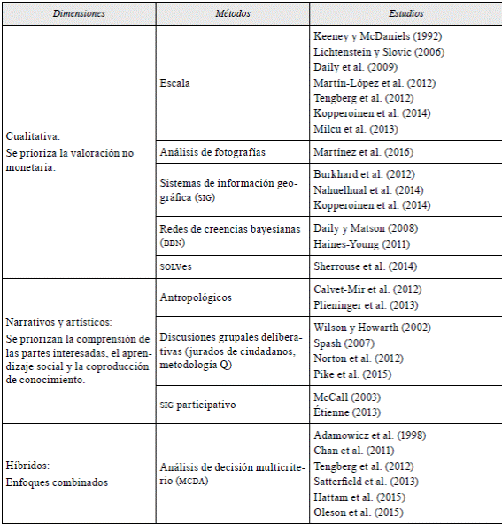 Por consiguiente, los sec han demostrado ser resistentes a la valoración monetaria, ya que muchos aspectos de los ecosistemas, como sus cualidades estéticas o espirituales, se valoran precisamente por los beneficios inmateriales que proporcionan (Scholte et al., 2015). En consecuencia, un grupo creciente de académicos ha desarrollado métodos de valoración socioculturales para captar el valor de los SE (Agbenyega et al., 2009; Casado-Arzuaga et al., 2013; Hartter, 2010; Martín-López et al., 2012), esto debido a que la valoración de los sec sigue siendo una de las tareas más difíciles y menos logradas en la investigación de los servicios ecosistémicos.
