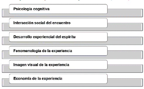 Con base en aportaciones previas sobre el tema, Ooi (2005) identifica en la literatura seis enfoques sobre el estudio de la experiencia turística (ver Figura 2), cada uno de ellos proporciona diferentes ángulos y perspectivas. En el primer enfoque, los investigadores centran su atención en la psicología cognitiva de las experiencias turísticas. En el segundo, los investigadores argumentan que las actividades turísticas permiten a los turistas ganar experiencias que se ven beneficiosas para ellos debido a la interacción social que generan. Este enfoque se presenta en gran parte de la literatura del turismo, en la que existe el presupuesto de que el viaje produce experiencias positivas o beneficios para los turistas; algunos de estos beneficios están relacionados con el aprendizaje de otros pueblos (Lee & Shafer, 2002), por eso, "la búsqueda de las experiencias en turismo es un medio para un fin, resultando en un aprendizaje, felicidad y memorias agradables" (Getz y Page, 2016). La tercera perspectiva está relacionada con el estado de la mente y con la profundidad de la participación experiencial. El cuarto planteamiento está asociado a la fenomenolo gía de la experiencia turística. El quinto expone la naturaleza visual de la experiencia. Finalmente, el sexto enfoque se refiere a la economía de la experiencia. Todos ellos se sintetizan en la Figura 2.
