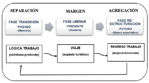 Por ende, se asume que el viaje es una etapa intermedia de liminalidad, donde tiene lugar la experiencia turística. Según las ideas de Turner, la concepción antropológica de la experiencia tiene como objetivo observar al individuo en la interrupción de papeles o roles de su comportamiento rutinario y repetitivo (cotidiano), que, en general, es iniciada por un "choque de dolor o placer" que invoca semejanzas con algún acontecimiento pasado, consciente o inconsciente de lo que le es familiar, capaz de dar luz a las emociones de experiencias vividas en el presente (Turner & Bruner, 1986). En otras palabras, en la fase liminar se requiere que el sujeto transforme lo extraño en familiar, pero al mismo tiempo sufre un extrañamiento con relación a lo que le es familiar.