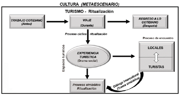 Por eso, el análisis de la experiencia turística requiere de nuevas conceptualizaciones orientadas a explicar el ritual de paso con énfasis en la fase liminar o "no cotidiana". El periodo liminar es influenciado antes y después de la realización del viaje, luego la experiencia de viaje es una fase de transición entre el pre y el posviaje, y la experiencia turística es ese proceso de transición al que se encuentra sometido cada individuo cuando está expuesto alternativamente a dicha estructura. Ello enfatiza el concepto de experiencia descrito por Turner (1974) y demuestra la posibilidad de que exista un momento único, especial, extraordinario, que ocurre durante vivencias particulares en diversas ocasiones de la vida. Con respecto a tales supuestos, el fenómeno turístico es el escenario cultural ("metateatro", en palabras de Turner) donde tienen presencia las experiencias turísticas, entendidas estas como dramas sociales (estructuras en conflicto), representadas por un proceso de ritualización como es el encuentro entre turistas y locales, que le asignan dis tintos significados en función de la "performance" desempeñada por cada grupo social participante.