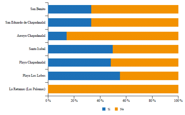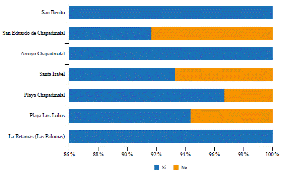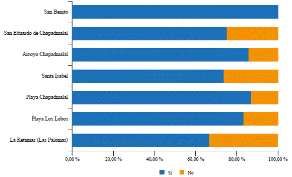 Al profundizar en el análisis, pero considerando ahora el barrio de residencia de los encues tados, se identificaron algunas variaciones. En primer lugar, para el 55,6 % de los vecinos del barrio Playa Los Lobos, esta nueva normalidad sí afectaría los usos de los lugares recreativos a los cuales asistían antes de la pandemia. En segundo lugar, en el barrio Santa Isabel hubo paridad en la respuesta, pues el 50 % de los participantes opinó que sí y el otro 50 % contestó que no. En tercer lugar, quienes opinaron que no podrían asistir a los mismos lugares recreativos ni hacer uso de ellos en la instancia de la nueva normalidad fueron los vecinos de los barrios Las Retamas (La Paloma), Playa Chapadmalal, Arroyo Chapadmalal, San Eduardo de Chapadmalal y San Benito (Figura 9).