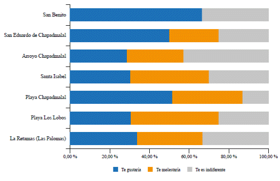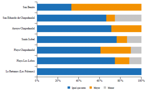 Además, hubo quienes mencionaron que las características de Chapadmalal asociadas a la seguridad, la tranquilidad y la posibilidad de estar en contacto con la naturaleza serían atractores capaces de generar un incremento de turistas en la localidad, lo cual produciría impactos positivos vinculados a un crecimiento económico local. Por otro lado, quienes manifestaron no estar de acuerdo con la llegada de turistas fundamentaron su respuesta en los efectos negativos relacionados con el impacto en el medioambiente y la alteración del estilo de vida de la comunidad local. De forma minoritaria, algunos tomaron una posición más bien indiferente ante la presencia de turistas, aunque dijeron preferir que se mantuvieran la armonía y el respeto por el barrio, sus vecinos y la localidad en general.