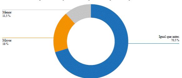 En relación con el tiempo libre que los encuestados pensaban que iban a tener luego de la pandemia, el 70,5 % creía que sería igual que antes, en cambio, para el 18 % sería mayor y para el 11,5 % sería menor (Figura 3).