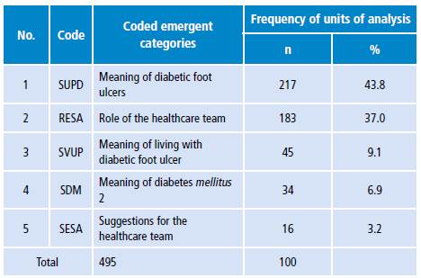 Focus group was selected as the qualitative technique for data collection (two groups of six members each). Testimonies were collected until reaching the point of saturation, that is, repetition of ideas or gathering enough evidence to guarantee the credibility of the investigation. 14 A guideline was used to ensure that all subjects were explored, for example: Can you say what an ulcer is for you? Have you heard of DF ulcer? What do you think was the cause for the occurrence of your ulcers? An audio recorder and field notes were used, with the corresponding authorization, to support the collection of information in an exact way, as narrated by the participants themselves.