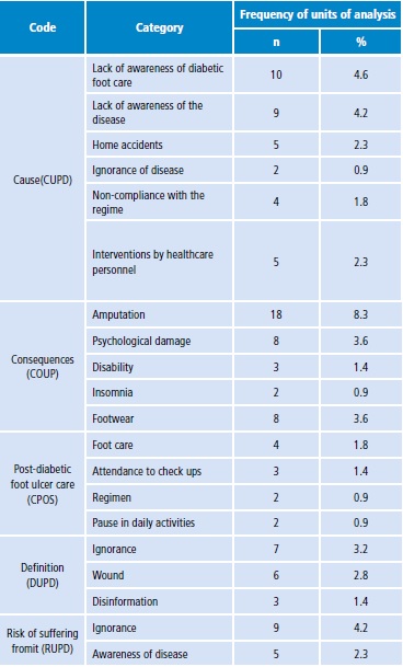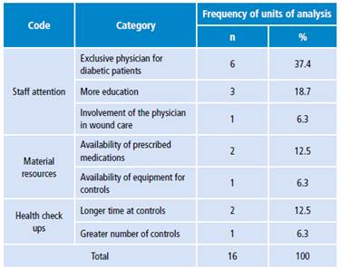 Given the specific objective of discovering the meaning of DF ulcer and DM2, some informants reported that it is a wound while others were uninformed. If they are asked about the types of ulcers, it is inferred that they do not recognize the word "ulcer" as an injury to their feet. However, the literature defines it as a "neuropathic-based clinical alteration induced by sustained hyperglycemia, in which injury and/or ulceration of the foot occurs with or without coexisting ischemia and previous traumatic trigger". (21, p1) All of this could be supported by what was expressed as "Suggestions to the healthcare team" in relation to the service provided by the staff, more education on the subject and the frequency of health checkups, since patients ask for longer interventions by the corresponding professionals.