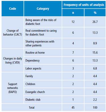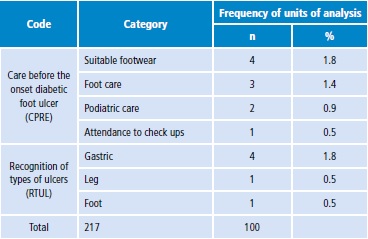 With respect to the risk of developing a DF ulcer, the literature states that "between 40 to 50% of diabetic patients will develop an ulcer on their feet during the course of their illness and, of these, 20% will require amputation". (21, p1) However, the key informants of this study refer ignorance of the occurrence of the ulcer, which may mean that not all of them have been educated on this issue and, therefore, do not know appropriate care measures to prevent a possible injury to their feet. In this regard, it is important to note that for DF prevention, the professional team, in addition to examining the lower limbs, must be able to motivate and educate the patients to check and care for their feet daily, encouraging self-care. 22